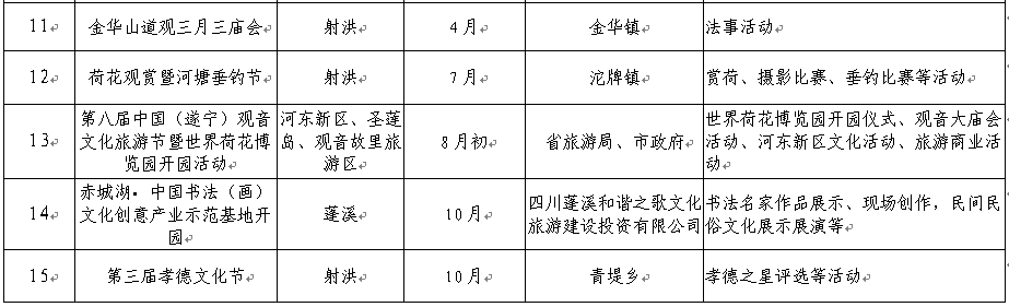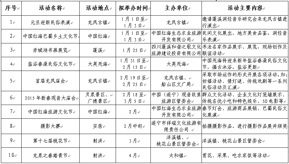 推进文旅融合发展,加快建设“五大旅游度假区”。坚持以会促发展机制,承办好2015年全省重点旅游项目推进现场会,举办好2015年全市旅游发展项目推进现场会。2015年,全市着力推进26个重点旅游项目建设,完成投资36.8亿元。市城区重点推进仁里古镇、养生谷花卉博览园、天友文化旅游城、荣海温泉度假酒店等项目建设,实现圣莲岛世界荷花博览园8月开园。大英县重点推进中国死海提升工程、浪漫地中海等项目;蓬溪县重点加快赤城湖中国书(画)文化创意产业示范基地、中国红海二期等旅游项目建设;射洪县重点加快子昂故里文化旅游度假区沐水小镇、郁金香大酒店等项目进度;安居区重点加快文旅园区农旅核心区项目建设。